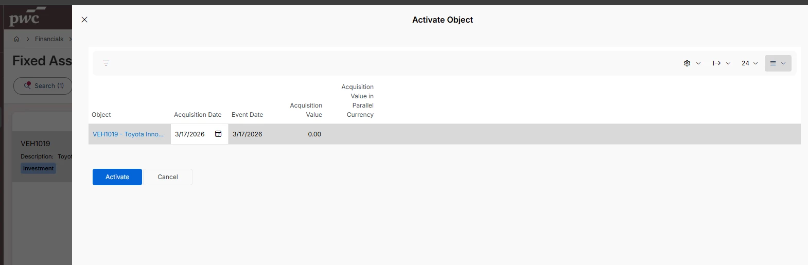 Fixed asset activation (acquisition value) is showing as 0