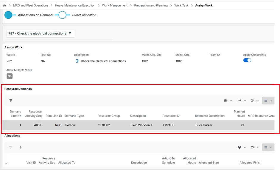 When WO is created, go to allocations, demand shows but not allocated, can we apply it automatically?