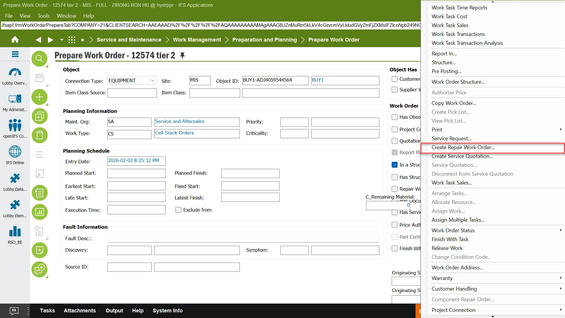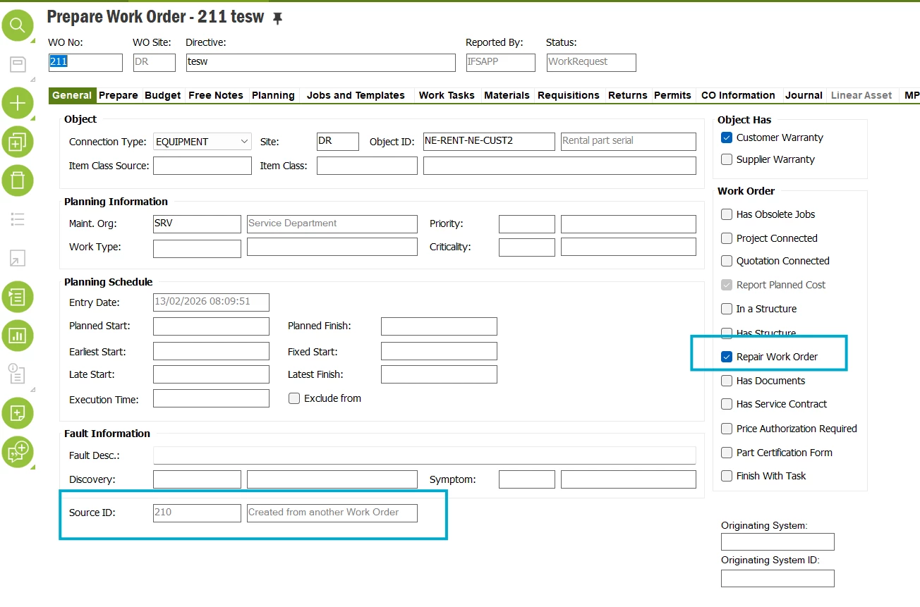 When I am creating Repair work order in below screen RMB function, work order is not automatically connected to its parent work order, in this case #12574, how to automatically make it a child to the work order that is initiated?
