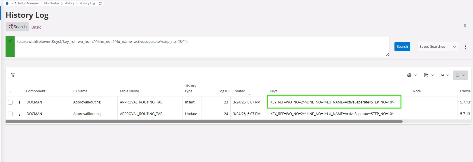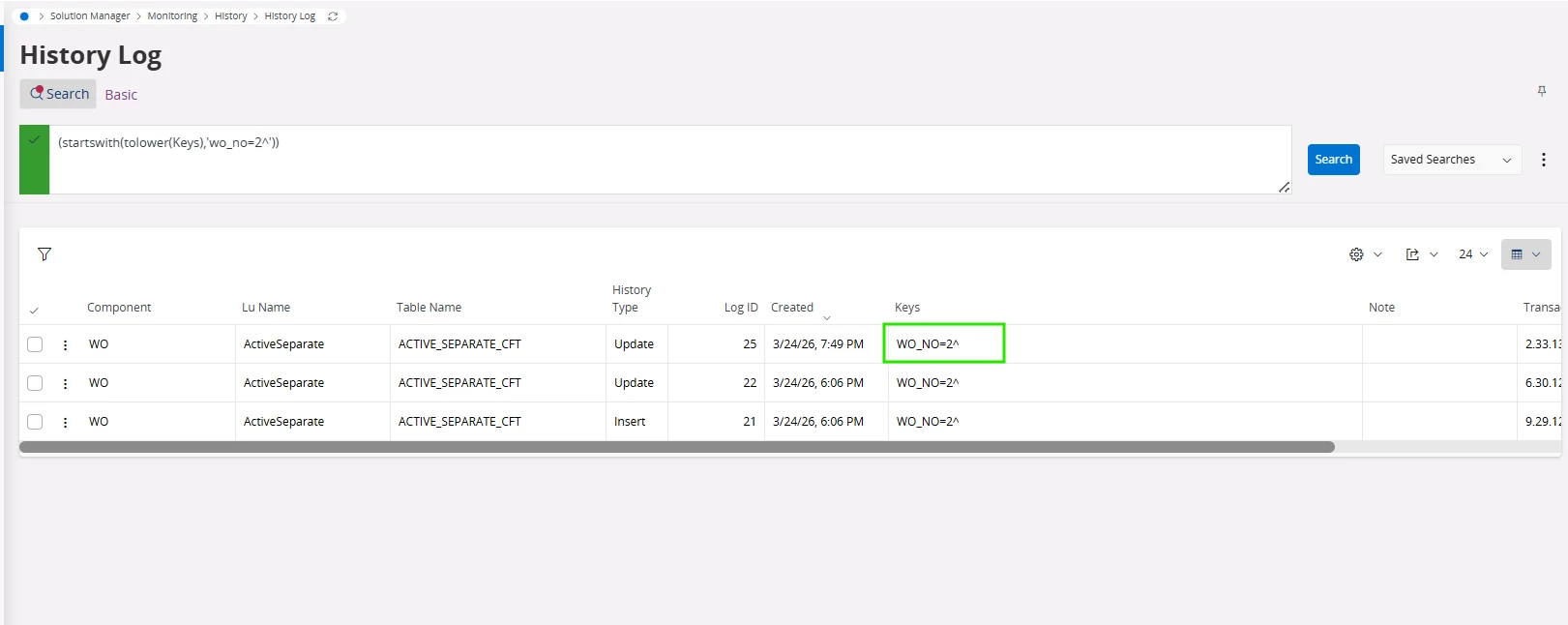 But it is not returning the expected records. History Log stores WO number inside the KEYS field, so I am trying to filter based on that value.