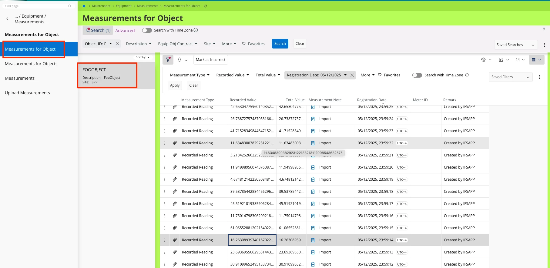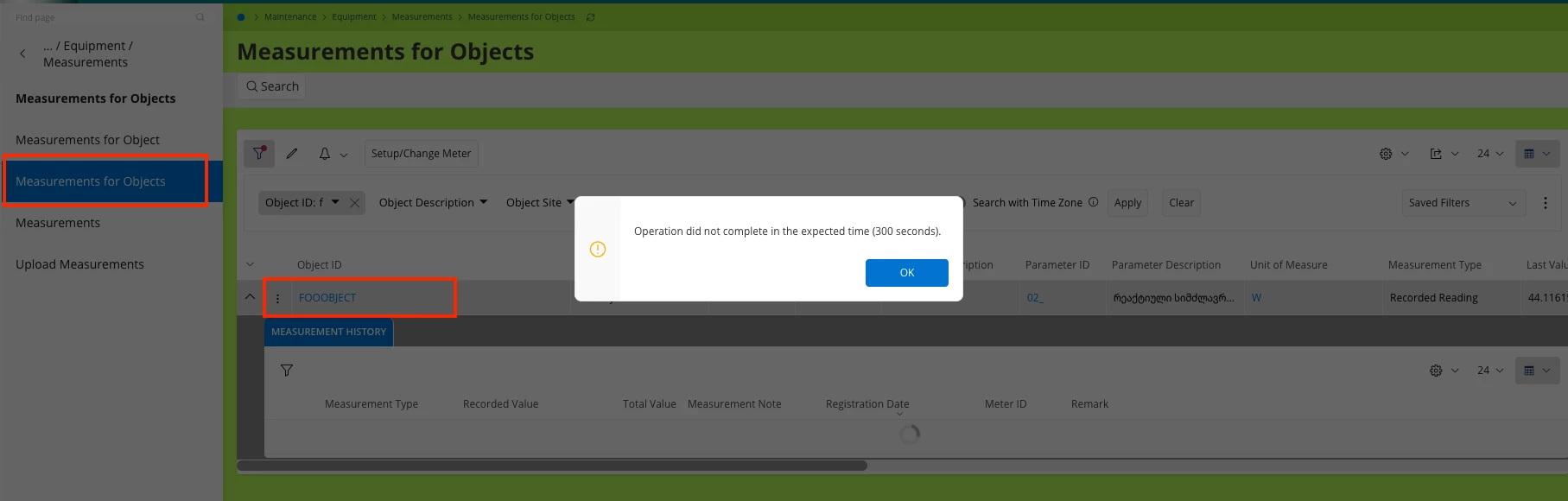 We uploaded a long list of measurements for the object (~80000 rows). When we try to see them in IFS Cloud in the form Measurements for Objects we got error - question subject. Attachment meas_obj_1.