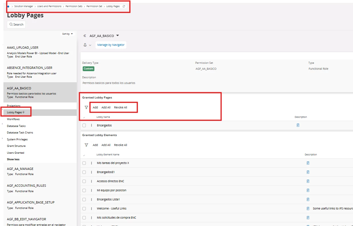 In the image below, you can see the buttons you have: Add, Add All, Revoke All. This is a problem because if you have, for instance, 20 lobby pages and one day you need to remove just one of them, now, IFS requires you to revoke all.