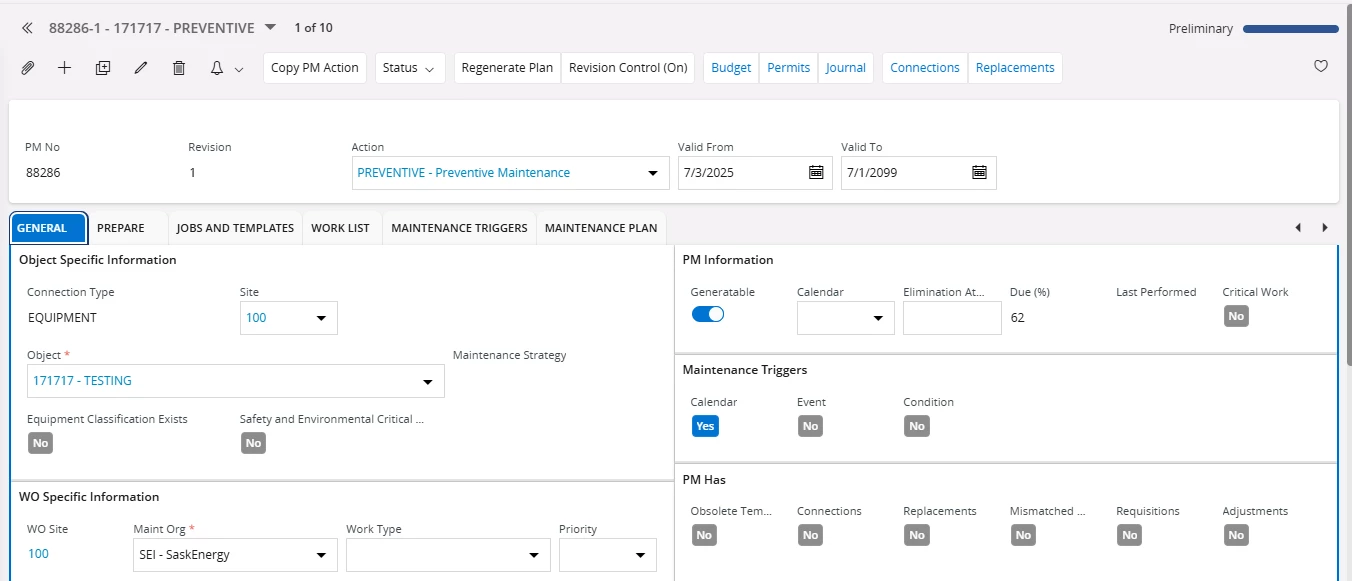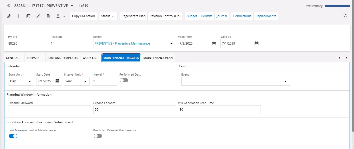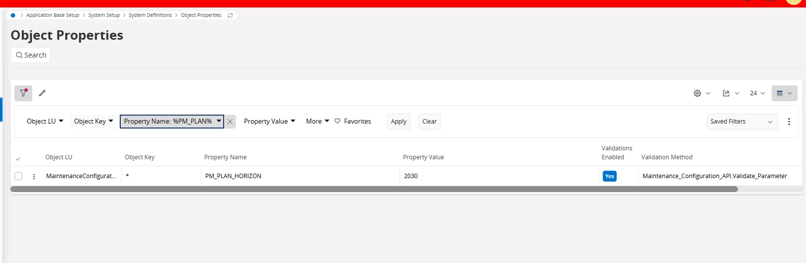 I created a PM action with a default calendar end date of 12/31/2030 and configured the relevant object properties. I also set the PM_PLAN_HORIZON to 2030. However, even with this setup, the maintenance plan that was generated is not exceeding more than 2027 (specifically it stops at 09/09/2027), despite the calendar and PM_PLAN_HORIZON being set through 2030.