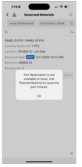 Part Reservation is not available to Issue. Use Planned Material to issue the part instead.