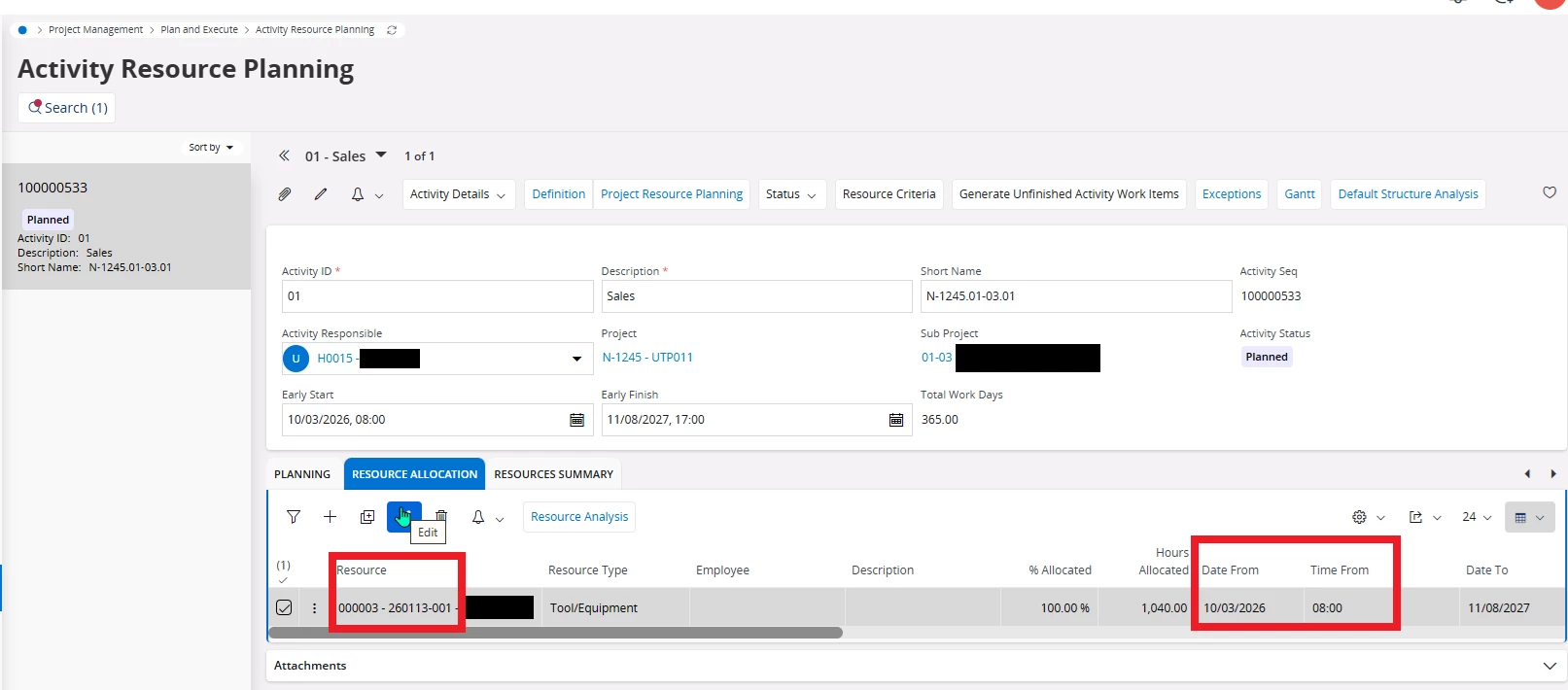 Project Activity with Resource Allocation: