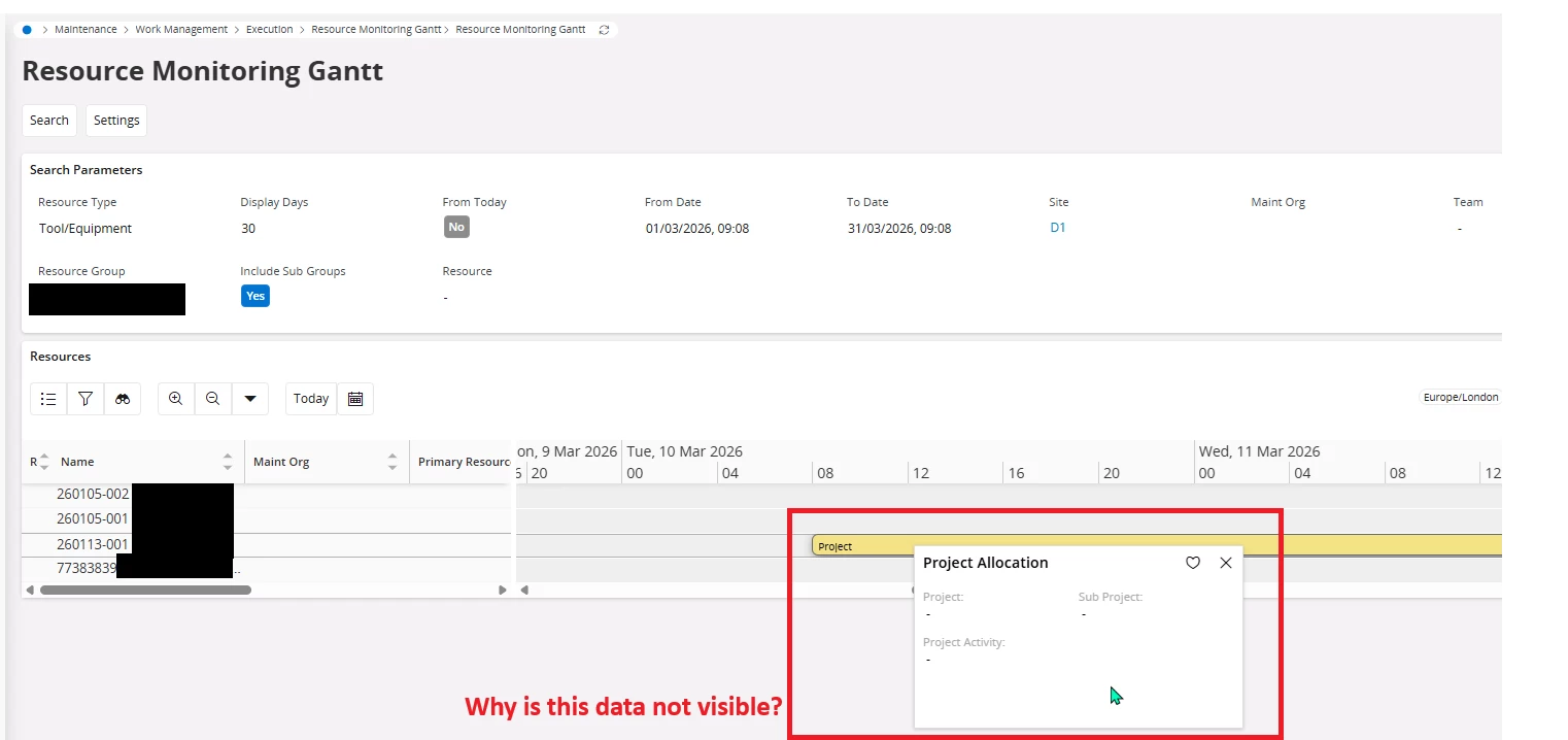 So, allthough it seemed to have worked to allocate the resource 260113-001 to the project N-1245 ; activity = 100000533 starting from March 10, 2026 8am onwards. When I hover over the Resource Monitoring Gantt, the Project Allocation screen does not show me the project info.