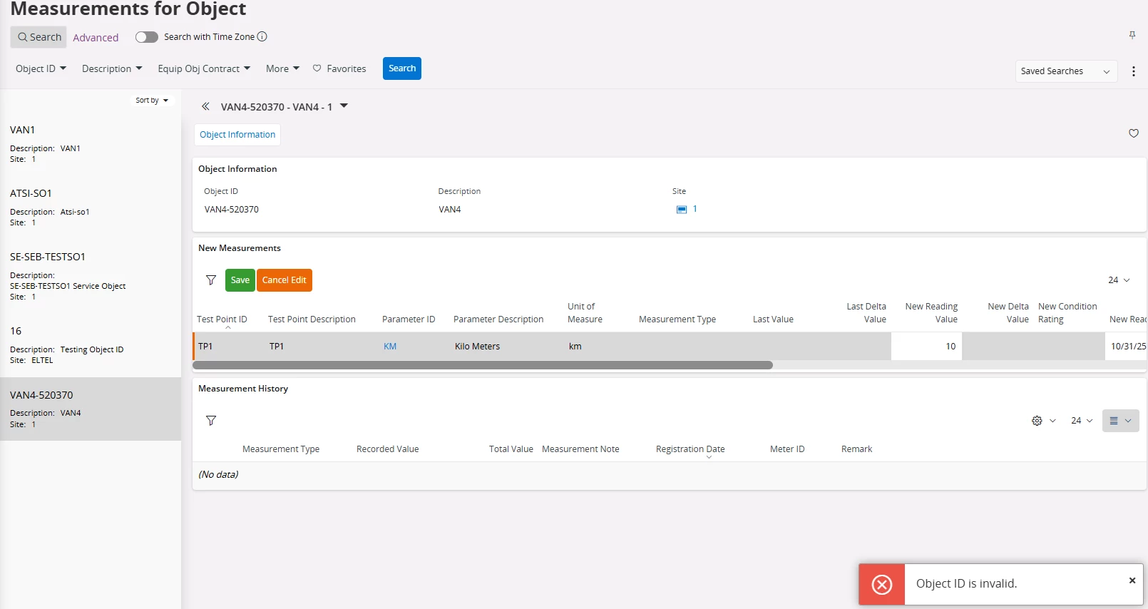 We are getting an error saying “Object ID is invalid” when we try to enter an measurement to object. What can be the reason behind this?