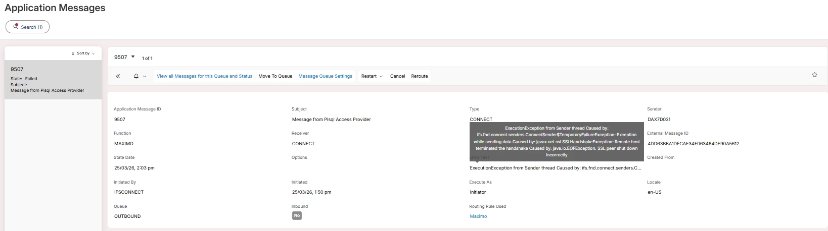 This error occurs during the outbound integration from IFS to Maximo, indicating that the SSL handshake between the systems is not being successfully established.
