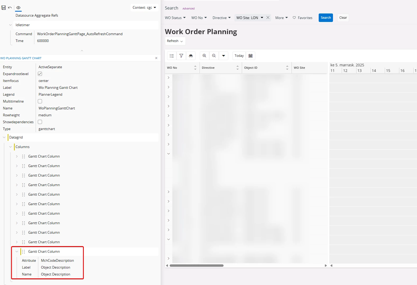 In Page Desinger go to “WO Planning Gantt Chart” → datagrid → Columns
