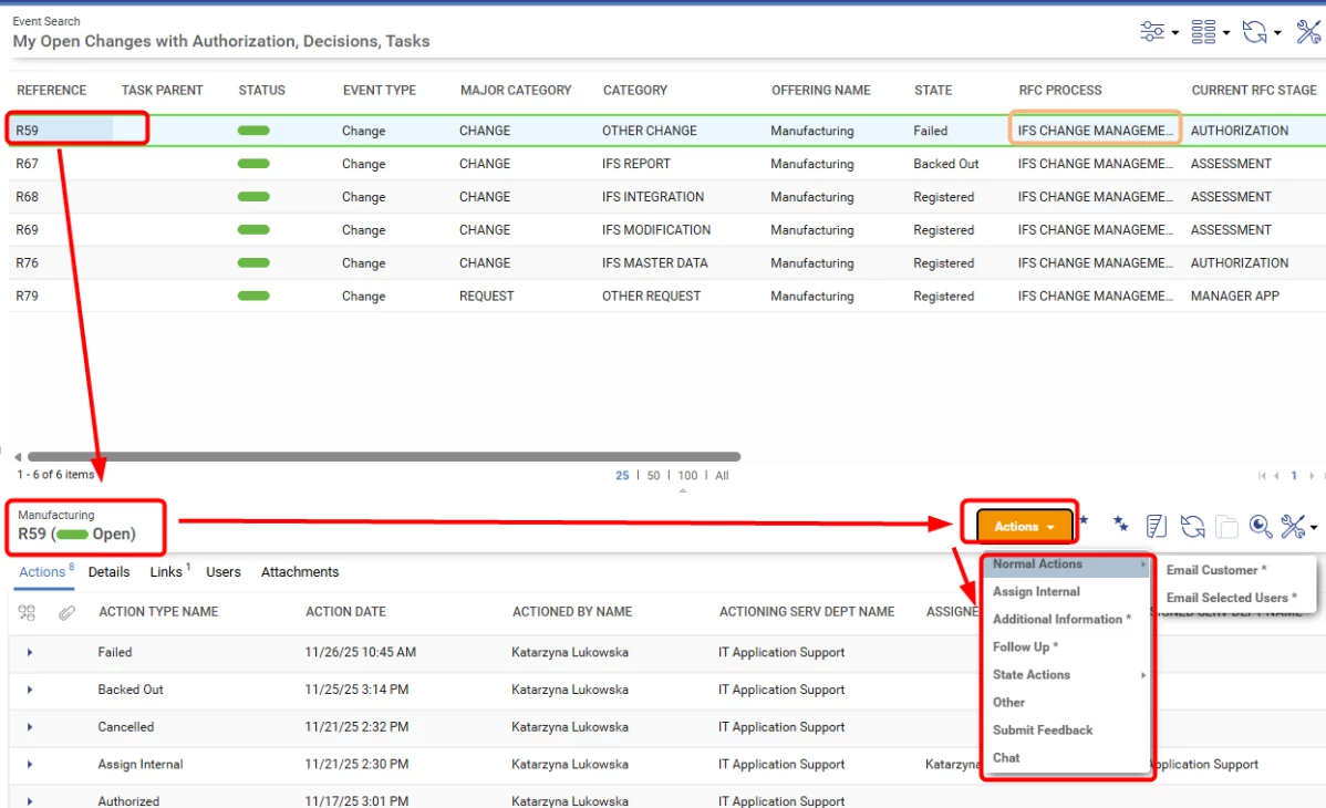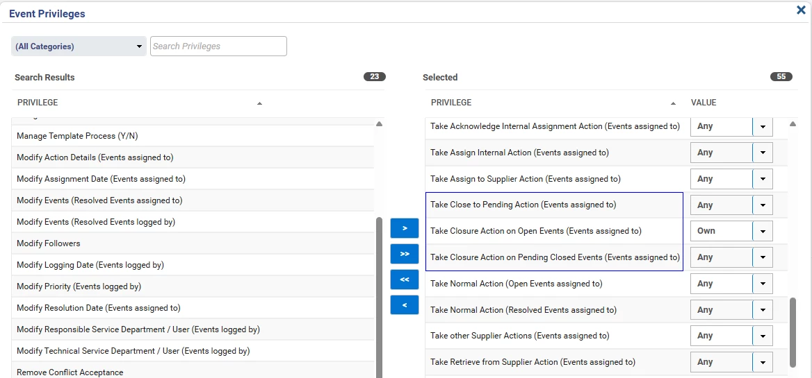 Could you help how to solve this and close those events? What is the Close action dependent on to allow user to close the event? What are the conditions for Closing the Event? And what are general conditions on the system actions whether they are available or not?