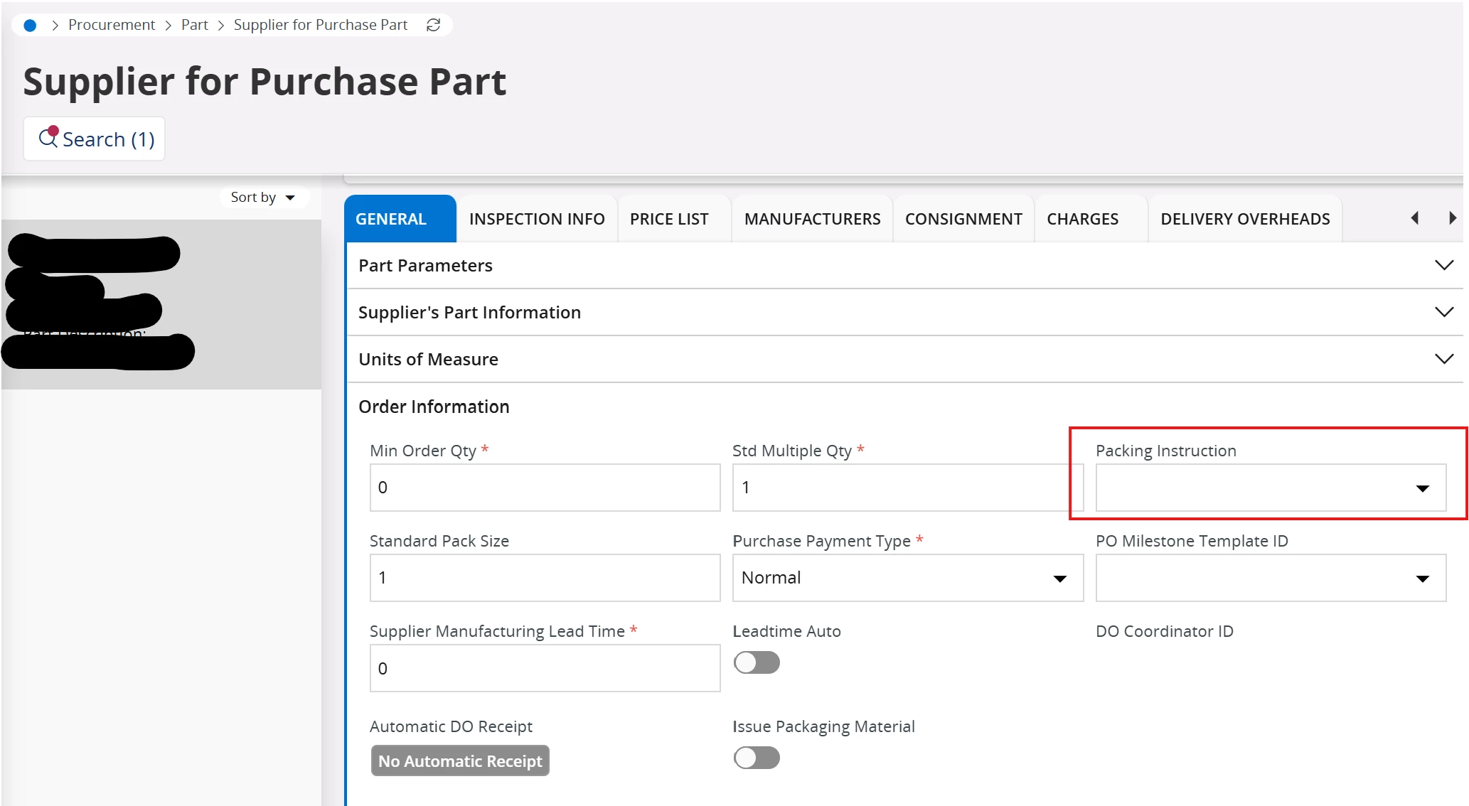 However, when I go to Supplier for Purchase Part, I do not see the Packing Instruction I created in any dropdown or selectable list.
