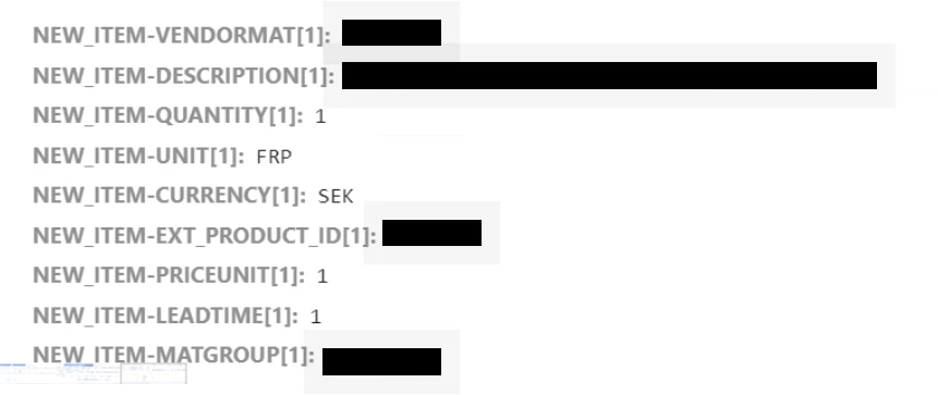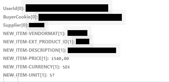 Our customer has an issue with OCI punchout with a supplier. Once the shopping is checked out no parts/lines are transferred from the punchout to IFS shopping cart. I investigated and found out that the JSON message we are receiving(for method Self_Serv_Shop_Cart_Util_API.Receive_Punchout_Response()) is missing parameters UserId, Supplier and most importantly BuyerCookie.