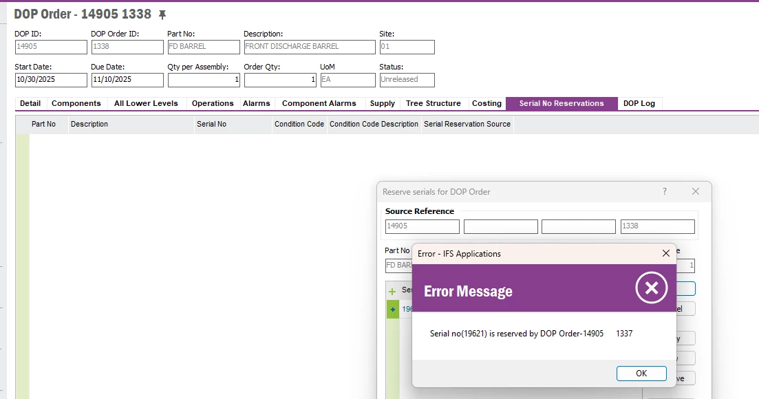 I am in the process of adding serial numbers in the DOP Header in IFS apps 10
