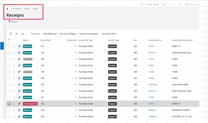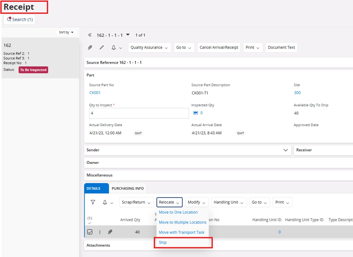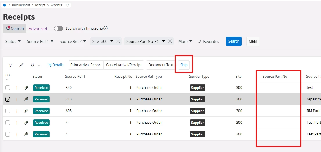 In cloud 25r1 does anyone know why the SHIP option does not come for inventory parts in RECEIPTS screen but appears for NO part lines?