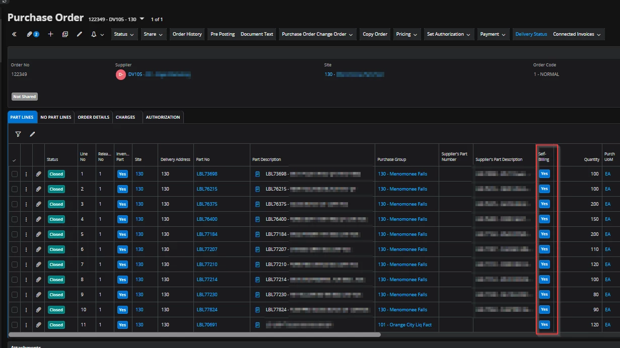 We have a supplier set up to be a self-billing account and when we receive product at our various sites, we are seeing the “AS” self-billing invoices processed and in our supplier analysis to be posted. However, we have recently added a new Site to our IFS system, and even though we are using the same supplier, the receipts done in this new Site are not being processed as a self-billing invoice. Is there another setting that we are missing or something else that has to be run that is Site specific?