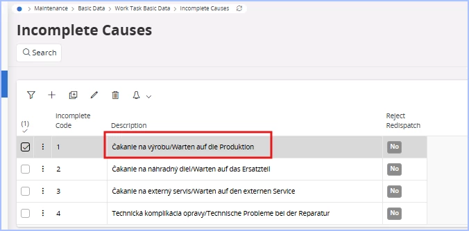 These values cannot be translated using Translatable Text, as they are not UI labels but internal business data (for example data maintained in Maintenance → Basic Data, such as Incomplete Causes).