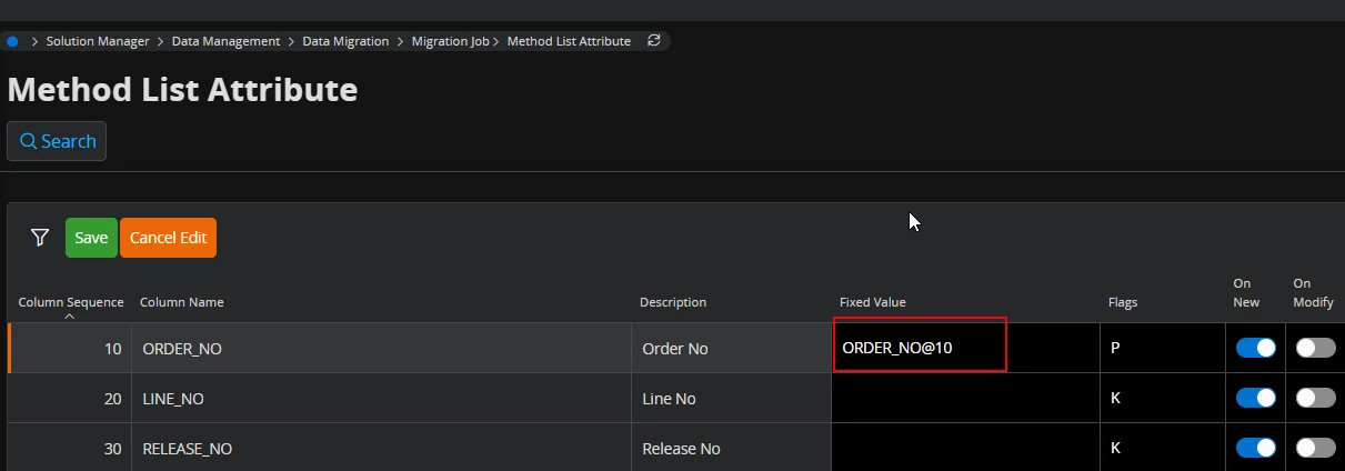 Are you passing the Customer Order Number via the spreadsheet, or is the system creating the order number in the first step of the migration? If it is created in the first step of the migration job, you will have to go to Method List Attributes on your second Method List item i.e Customer_Order_Line and define Order_No@10.