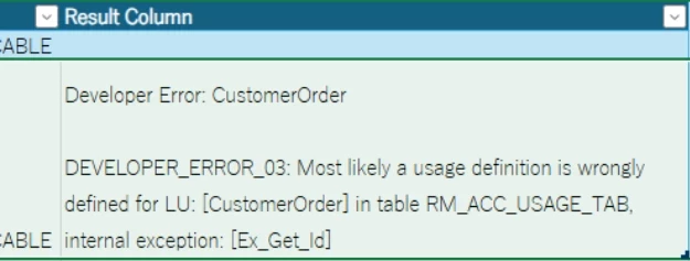 However, when I try to insert both the header and line items, I get the error "DEVELOPER_ERROR_03: Most likely a usage definition is wrongly defined for LU: [CustomerOrder] in table RM_ACC_USAGE_TAB, internal exception: [Ex_Get_Id]."