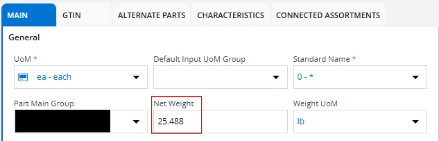 In the master part we are migrating 25.488 as the net weight for one of our parts. Somewhere along the line, it was changed to 25.488581893. Given the high number of decimal places, I suspect an automated calculation or a UOM conversion is at play.