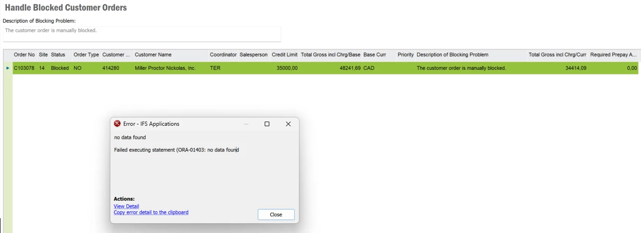 An error "ORA-01403: no data found" we tried to release a blocked order in "Handle Blocked Customer Orders".