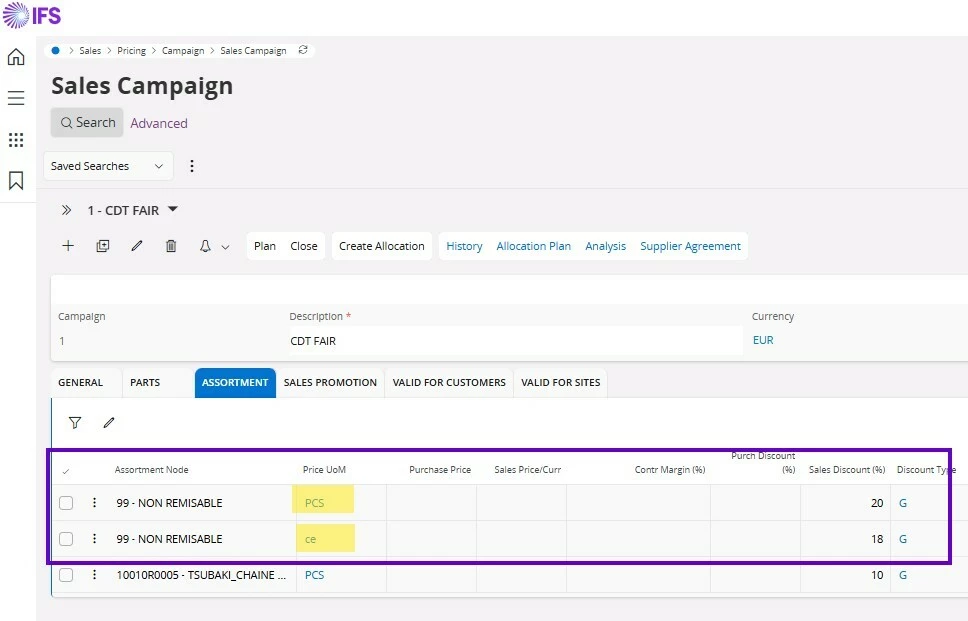 Within an assortment node, if items have different price units, it is mandatory to repeat the assortment node for each price unit in the campaign's assortment tab.