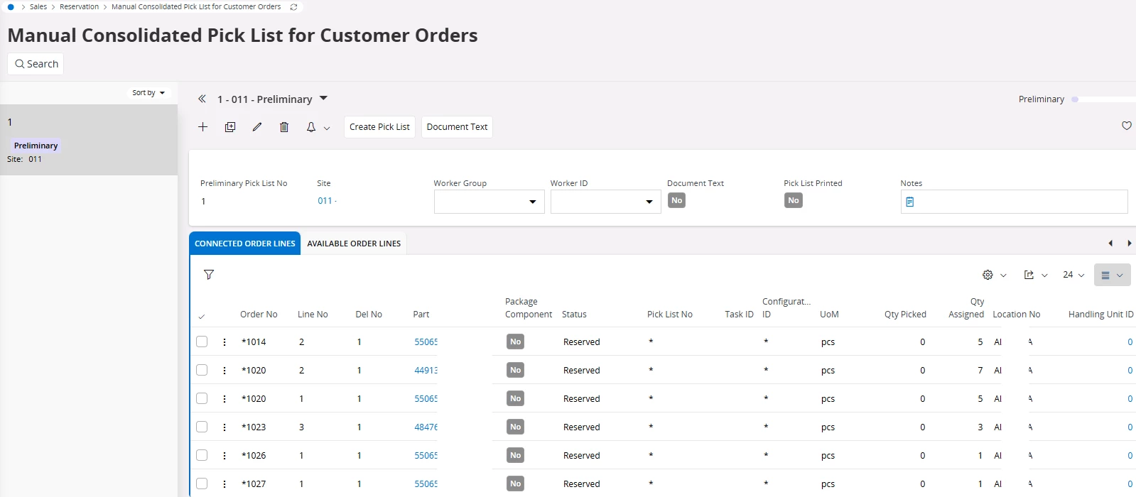 If all lines have been reserved, there is no option in IFS Cloud to select some customer order lines and print the customer order pick list based on that selection.