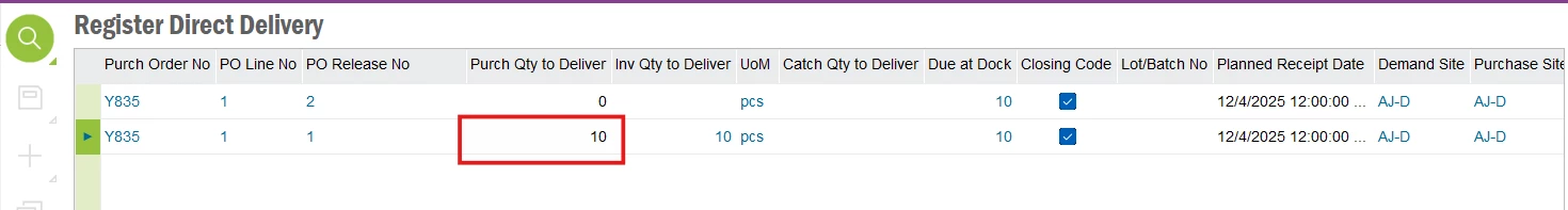 I’m running inter-company flow with direct delivery. Let’s assume for a particular demand, I created two shipments from supply site. How can I now record one shipment as completed in register direct delivery page at once without selecting all the lines manually?