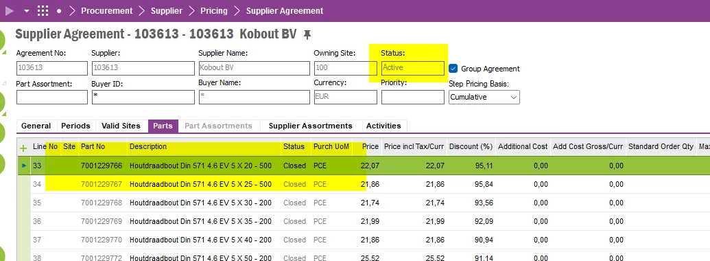 In IFS, an Active status on the Supplier Agreement header only confirms that the agreement itself is valid, not that all underlying part lines are usable. Once a supplier agreement part line is set to Closed, it becomes historical and is permanently read-only. Closed lines are excluded from pricing updates, recalculations, and sourcing logic, and they cannot be reopened, updated, or reused even if the agreement header remains active.