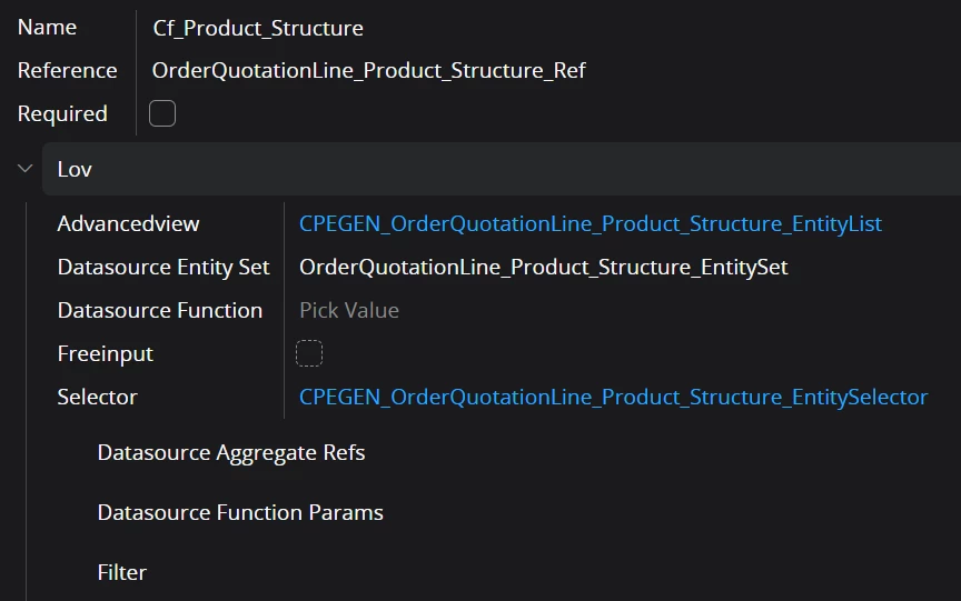 Right now, the LOV shows all product structures for all parts and the user has to manually filter the list based on the sales part. I want the LOV to default the Part_No filter to the Sales Part (CatalonNo) chosen on the OrderQuotationLine. I cannot find a good walkthrough online. Can anyone assist?