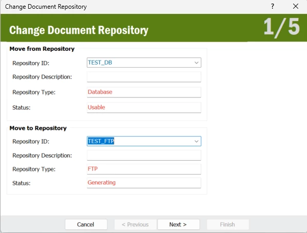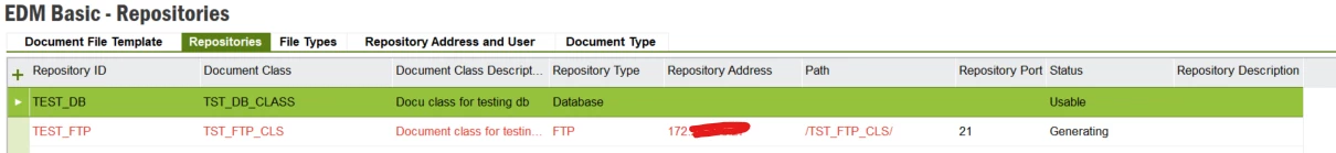 - I have two repositories: TEST_DB and TEST_FTP. The TEST_DB is of the ‘database’ repository type and is set to the usable state, while TEST_FTP is of the ‘FTP’ repository type and is set to the generating state.