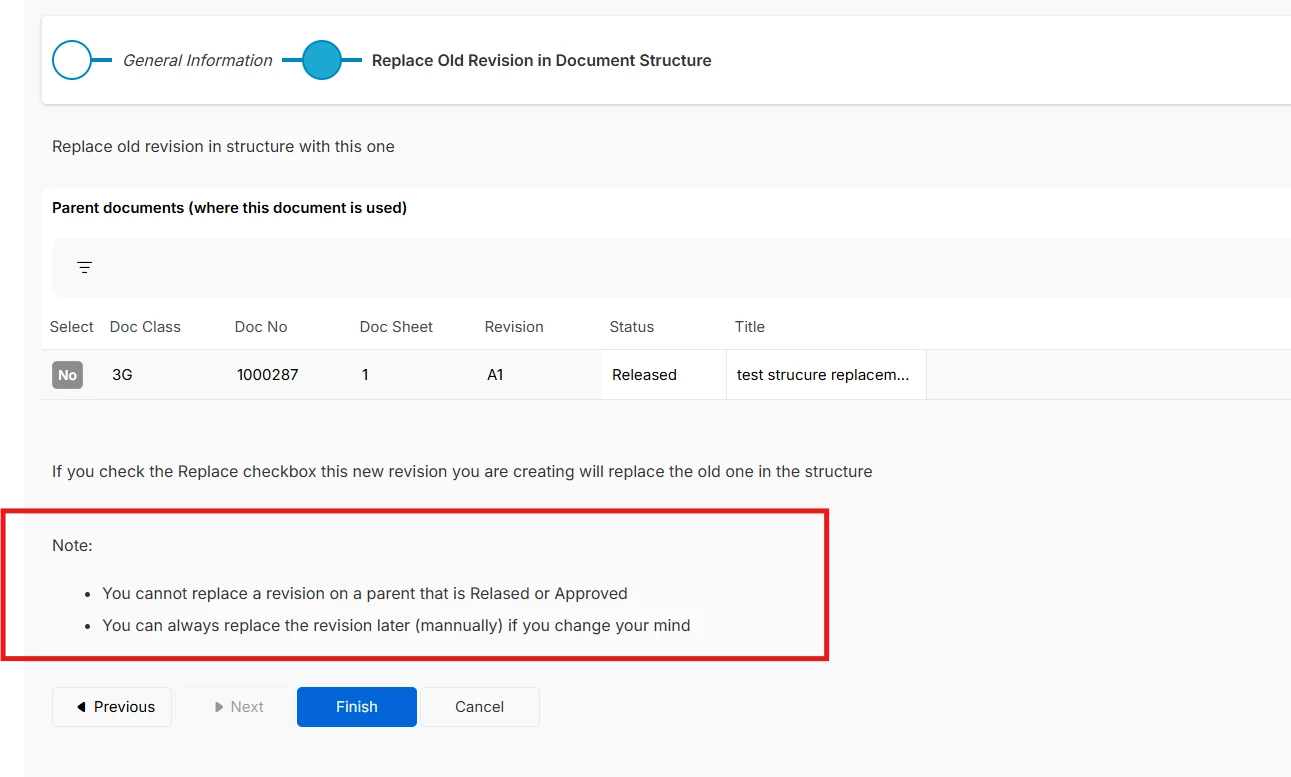 When creating a New Revision, there is a statement saying You cannot replace a revision on a parent that is Released or Approved.