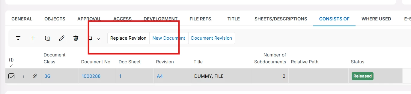 From what I have read, when a Document Structure is Released with Released Documents in the Consists of Tab, the Structure Documents are Locked. To Revise a document in the Consists of tab and Replace the previous Revision, the Parent Document Revision needs to be Revised.