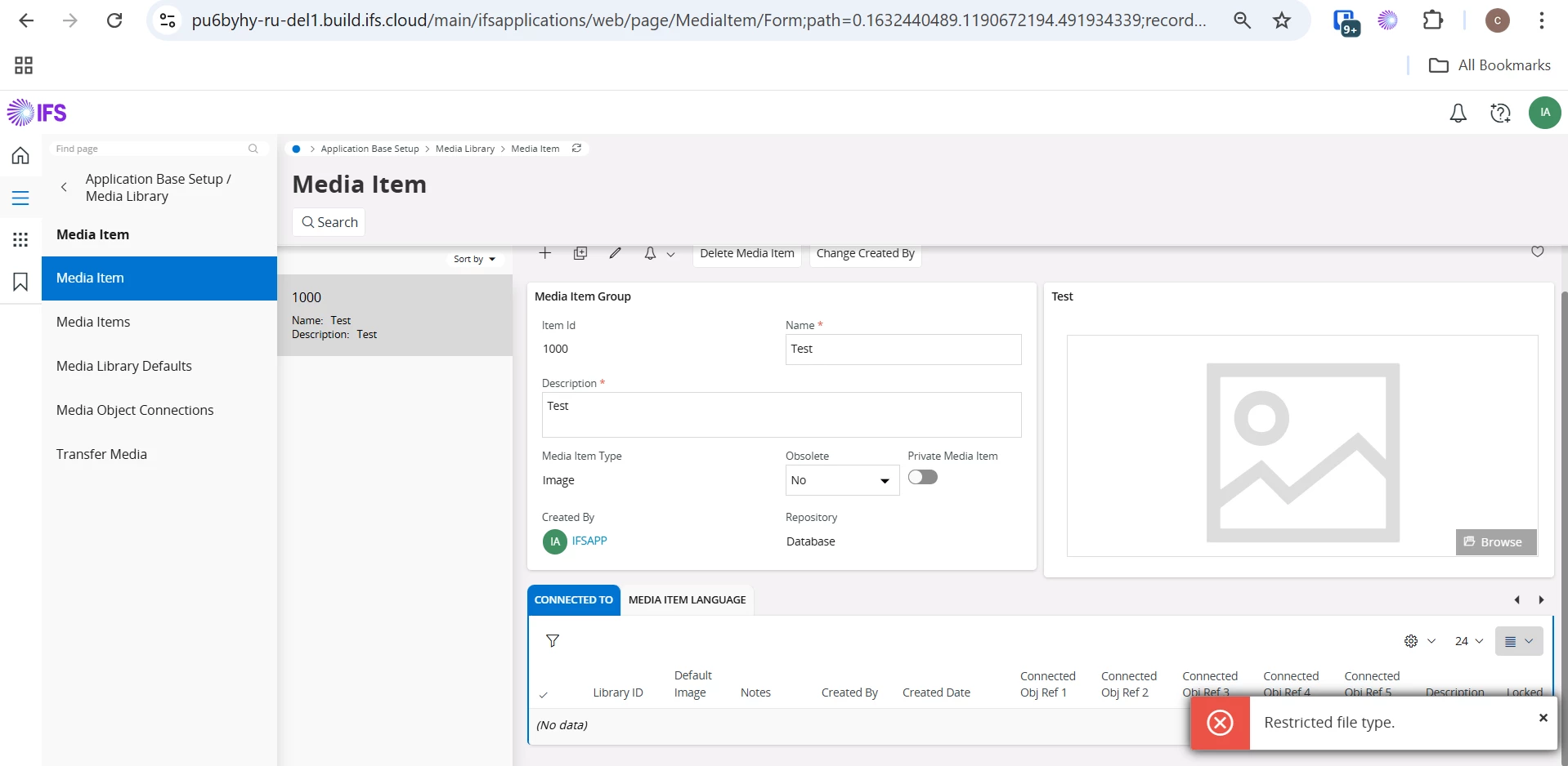 I am facing an issue in IFS Cloud 25R1 when trying to use Media Items.