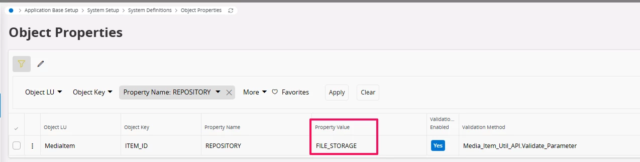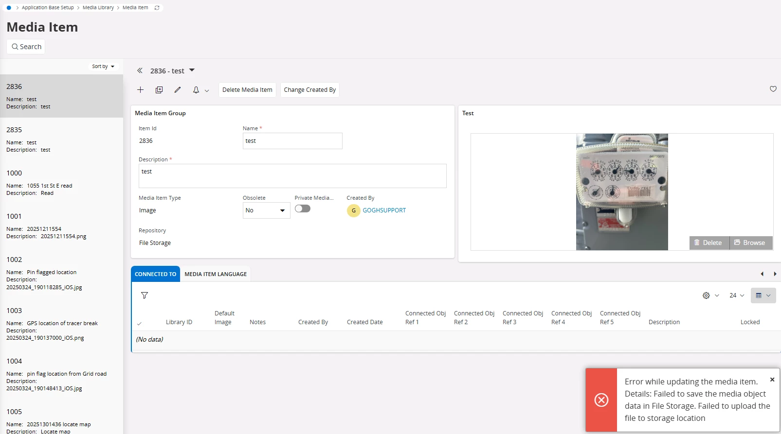 2) Additionally, when attempting to upload an image to the Media Item, with the object properties Repository Value set as “File_storage”, I get the following error