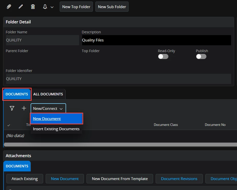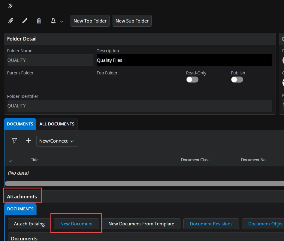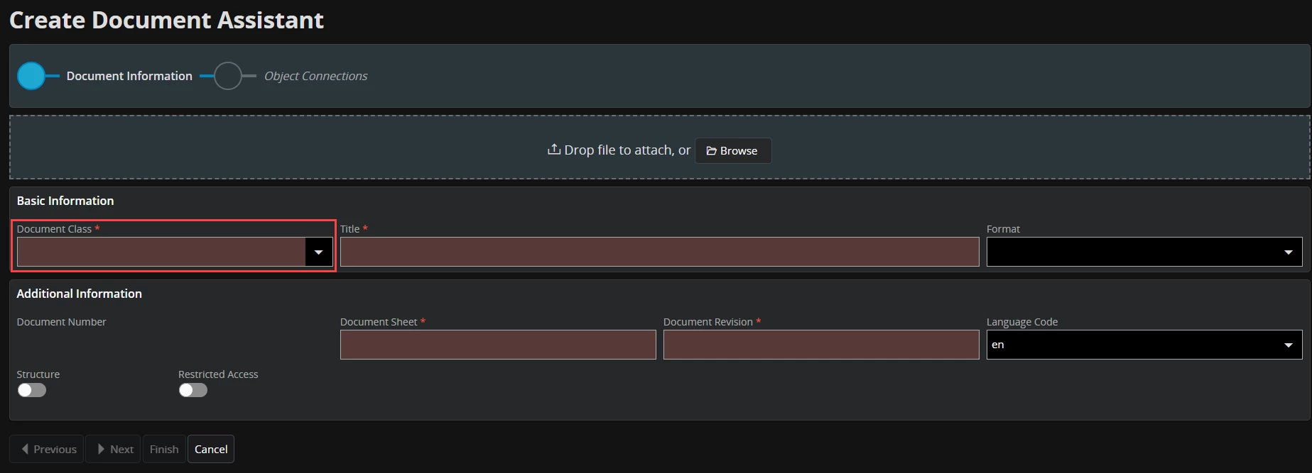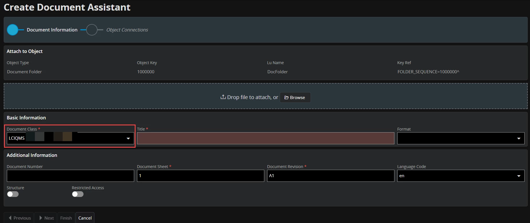 Using the New Document command in the Documents tab of the folder, however, does not pull in the default Doc Class in the Create Document Assistant. Also missing here in the Assistant is the Attach to Object Panel in the Document Information step.