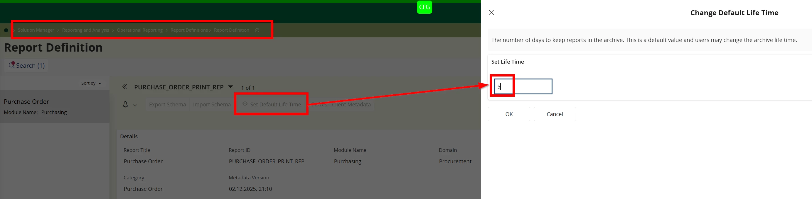 This is setup in Report Definitions. There is another background job - Heavy Cleanup that runs daily and deletes the data in pdf_archive_tab according to the default lifetime