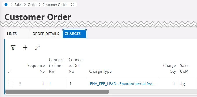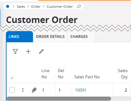 I have connected a charge to sales part 10091. And when adding this sales part on the Customer order, a charge line is created in tab charges.