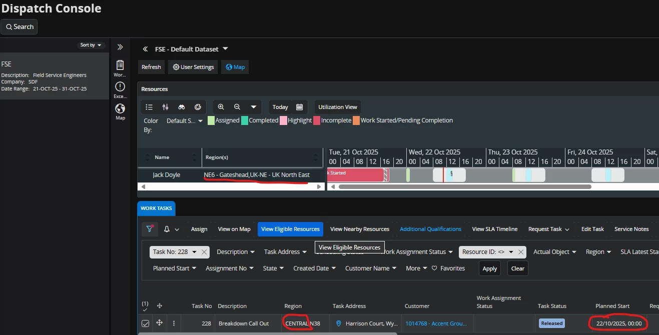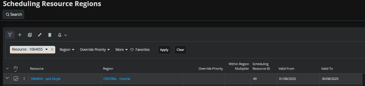 I’d like the View Eligible Resources button to filter my Resources by Region availability AND the Valid From - Valid To Dates. See my example below, this Resource will be available in the CENTRAL Region throughout August 2025 - Work Task Object’s Region is CENTRAL.