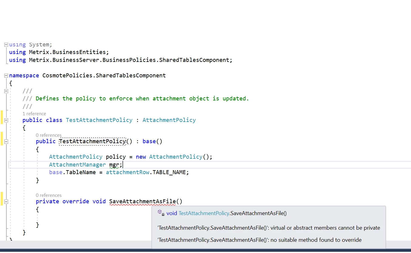 We have a requirement to save attachments in FSM based on File Type in respective folders. For example, Solution document type to saved into the folder Solution created inside the default File Attachment directory. We were advised that we can try extending the method SaveAttachmentAsFile in AttachmentPolicy file. I tried creating a custom Attachment Policy and inherited it from AttachmentPolicy class. But I am not getting an option to override the method SaveAttachmentAsFile.
