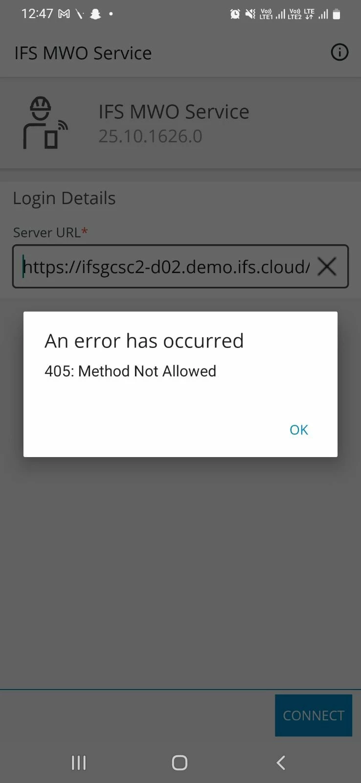 Facing an issue while tried to login in IFS MWO service mobile application.