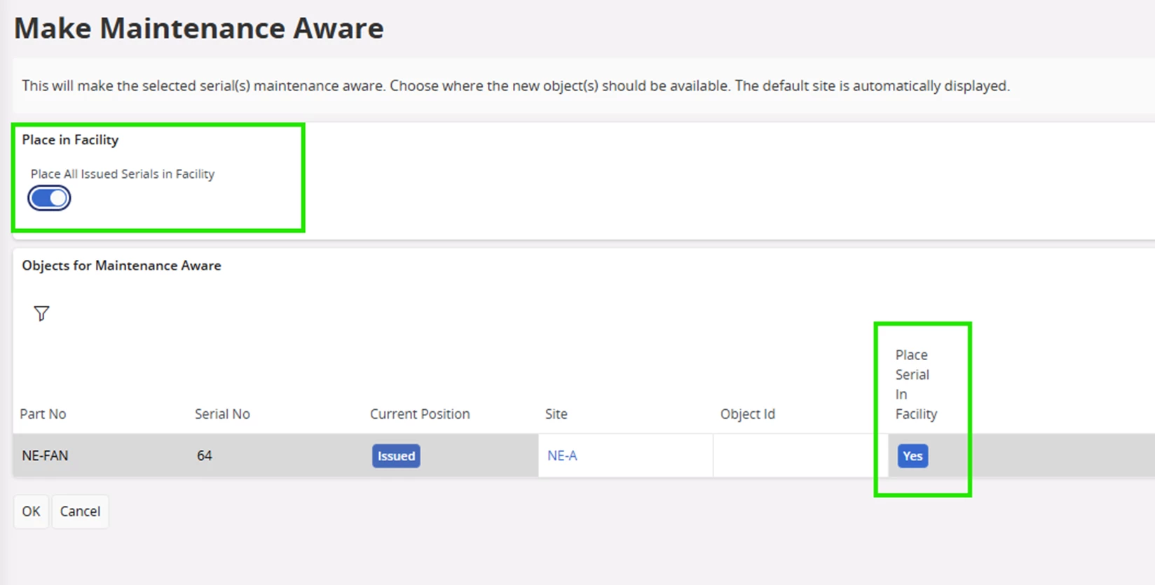 there is an option in Make maintenance aware, but there is no edit option to change the place serial in facility toggle.