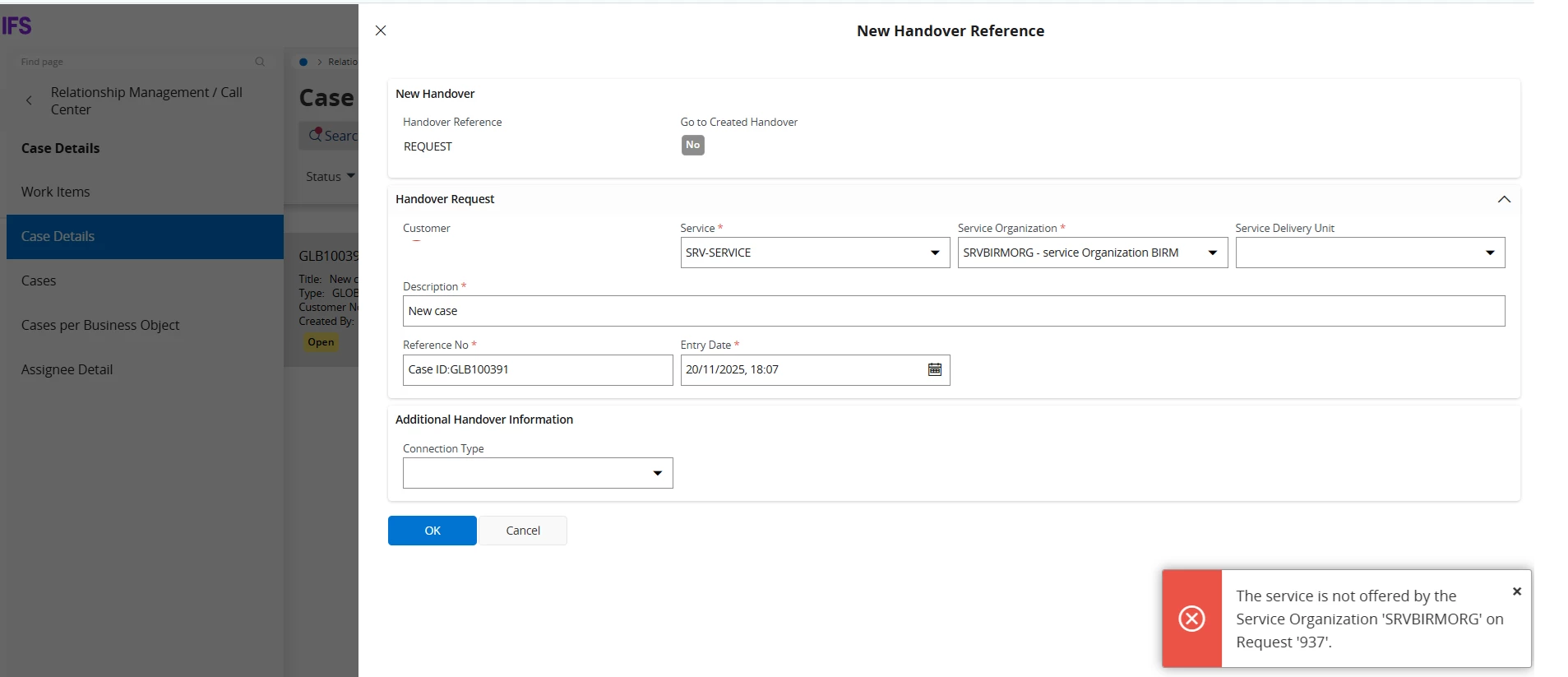 I was trying to initiate a Hanover to a Request, though I get below error. My service organization is the one responsible for the service(Setup in the service catalog). Therefore, this error is meaningless as I see. Further, the error shows a Request id, which is very strange, because system does not create a new request (error stops processing any further). Also, this number increments with the attempts I do. Looks like this is a core bug. I wonder if someone has tried and has different opinion or confirmed by the product team that this is a bug?