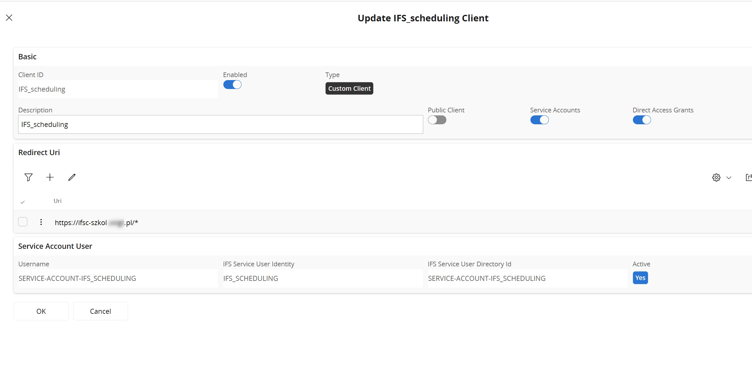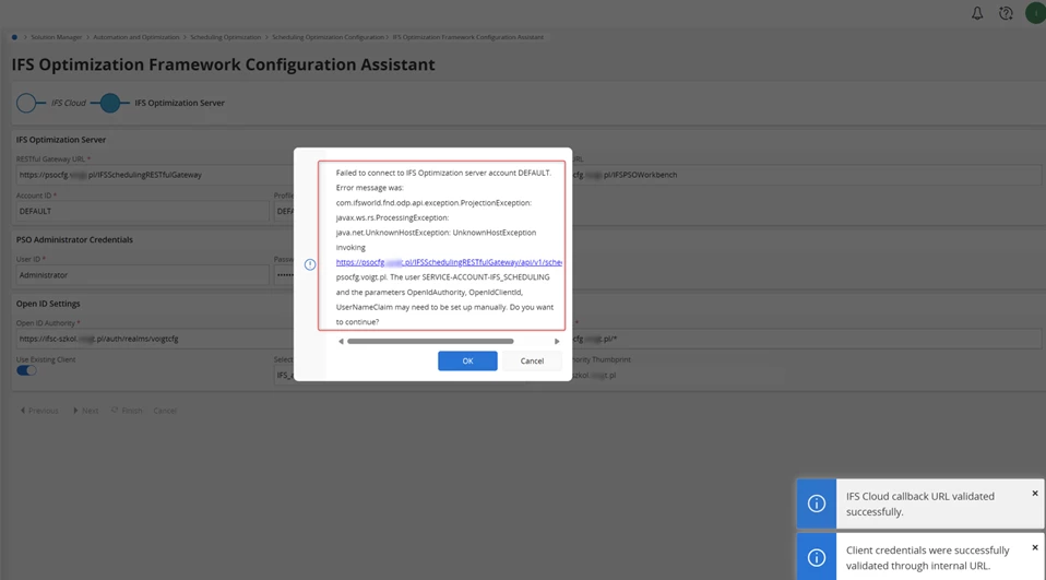 “Failed to connect to IFS Optimization server account Default. Error message was: 403 - Forbidden. The user IFSSCHEDULING and the parameters OpenIdAuthority, OpenIdClientId, UserNameClaim may need to be set up manually. Do you want to continue?”
