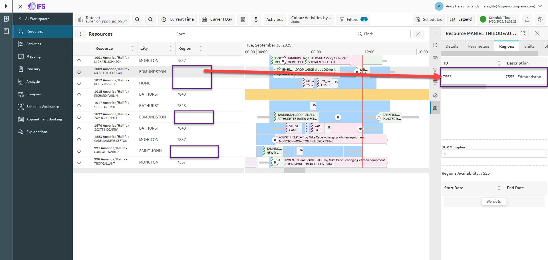 Is anyone able to tell me why some resources are missing their assigned “Region” field when viewed in the Resources menu of the Scheduling workspace?