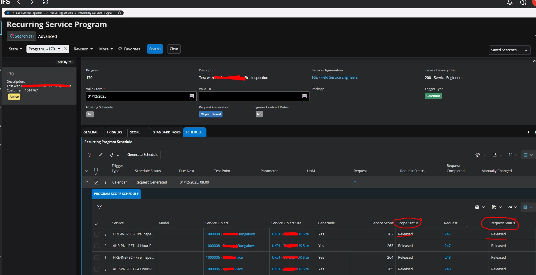 Below I’ve created 4 scopes from an Recurring Service Program (Object Based). As you can see these Requests and Scopes have automatically been Released.