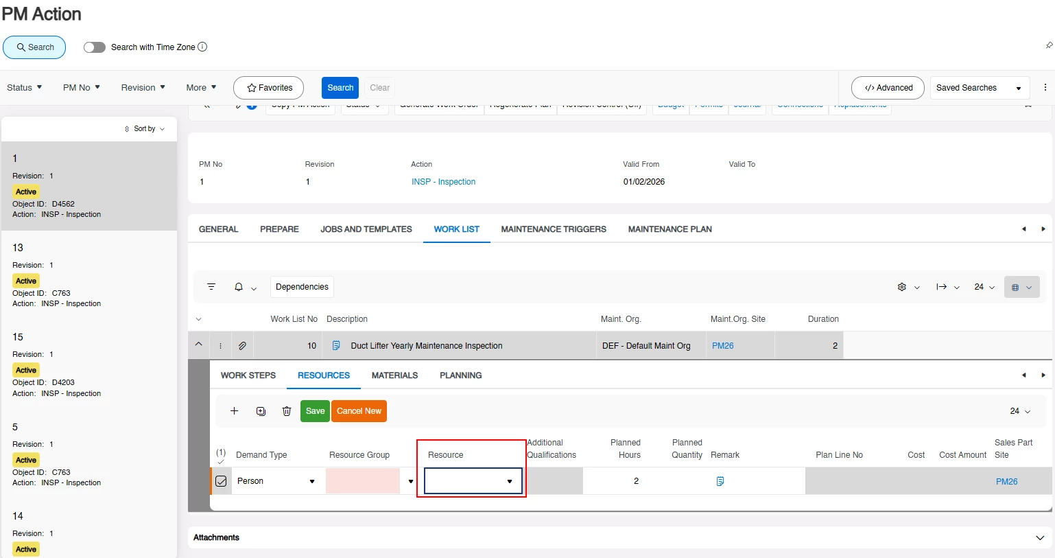 In the ESM solution, when setting up a PM Action, we can default a resource for the work list.