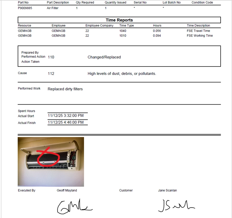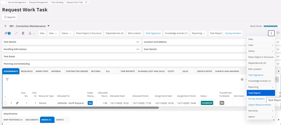 Service Report for Request Work Task, similar to the report generated from MWO (Mobile Work Order).