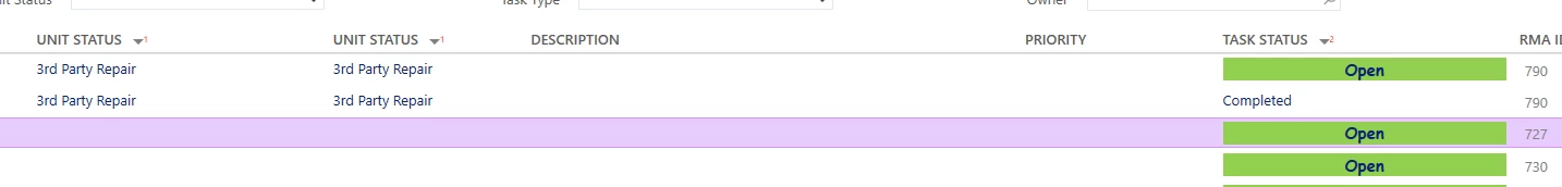If you were to add repair_center_view.task_status to the repair center result list, you would then be able to sort on task_status. You could add the field and make it hidden and the sorting would still work. The baseline repair_center_view has the following fields that match with 2 of the fields that are on the original search result list (Unit_status and task_status). If you wanted to allow sorting on any of the other fields then you would need to modify the view to include those additional fields and then add them to the search result list. In my screen shot you can see that I have unit status on the list twice and I am using it for sorting and I am also using task status for sorting, but you only see it once, as I have made the second one invisible.