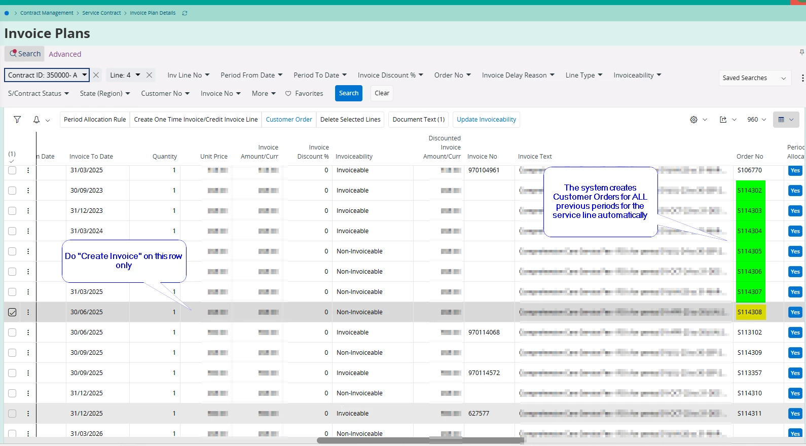 In Cloud 25R1, if I select a future period in Service Contract Invoice Plan Lines page and raise an invoice - the expectation is that the system raises only one invoice (CO) for the selected row. But instead, it raises invoice (CO) for ALL the previous, non-invoiced periods. See below: