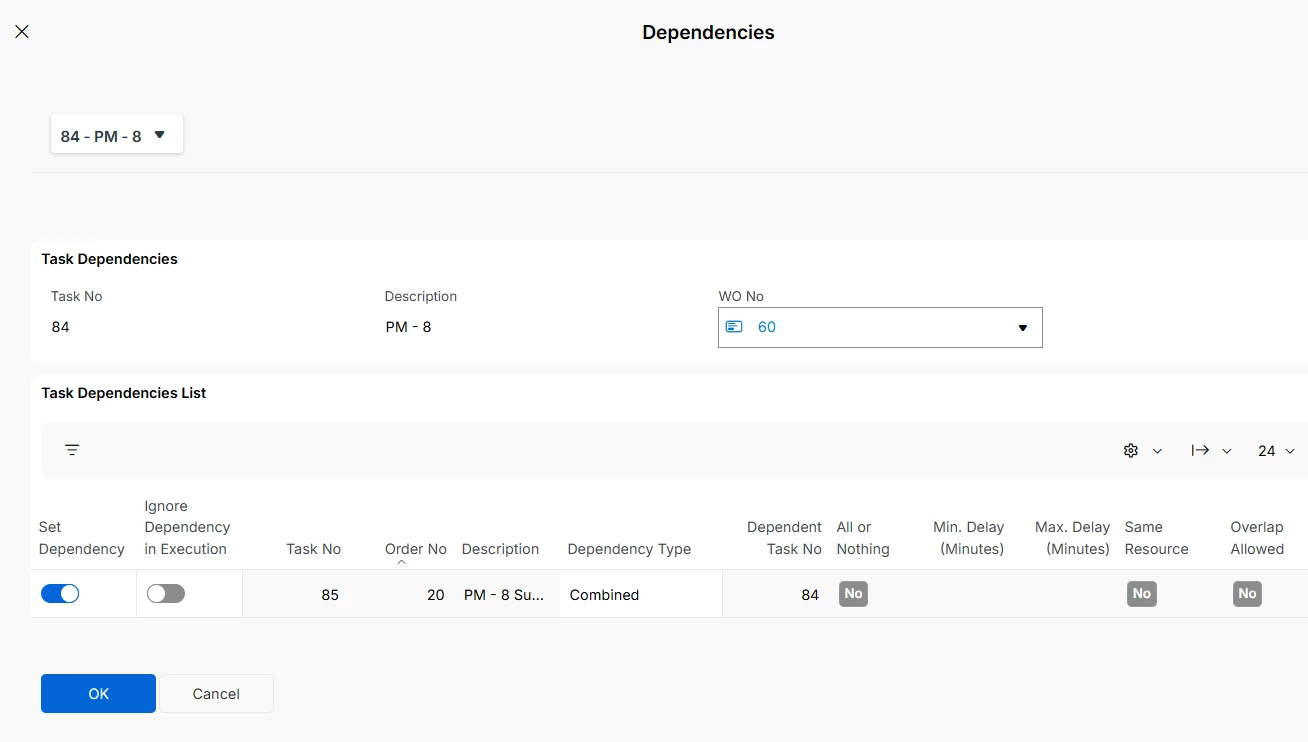 I’m working with a Work Order that includes two Work Tasks: one handled by an external resource and one by an internal technician. These tasks are linked by a dependency and must be executed together.